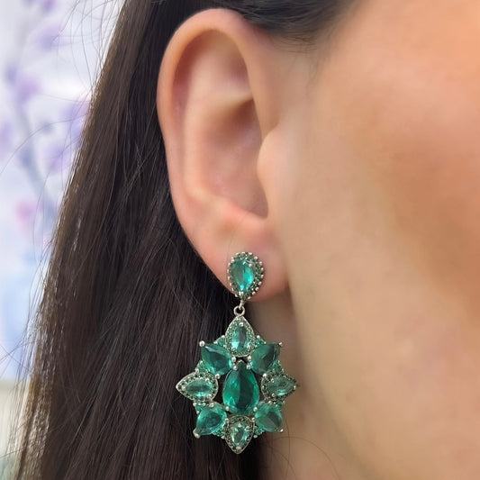 أقراط متدلية من الحجر الأخضر على فستان السهرة